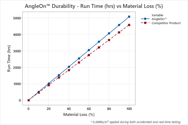 The graph below charts run time (in hours) against material loss (in 10% increments), comparing the performance of AngleOn™ with a leading competitor.